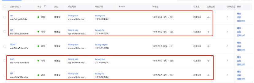 - 分别为两台服务器添加lan口和ha口的弹性网卡,并绑定到服务器
