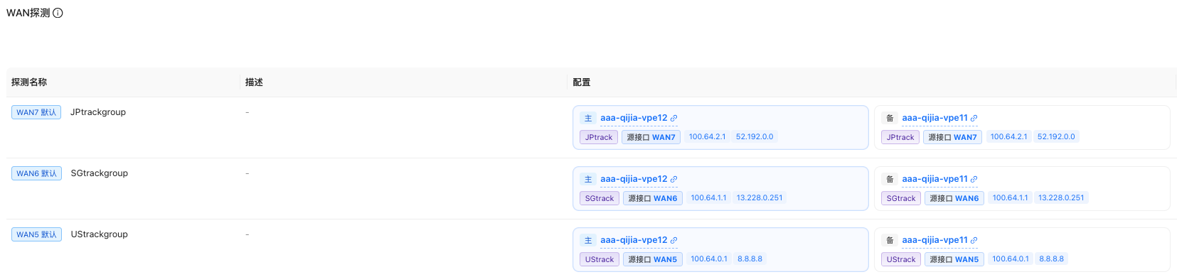 - 同一 WAN 接口仅允许配置一个默认探测组